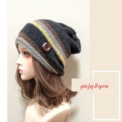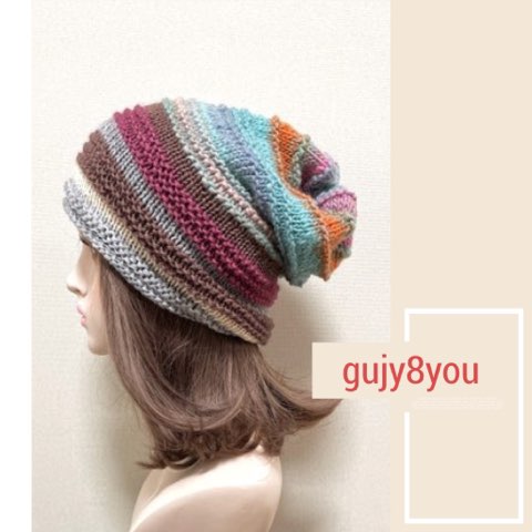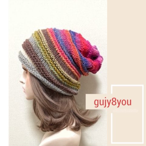 カラフルなゆったりボーダーニット帽です。とても元気をもらえそうなアイテムです😊
