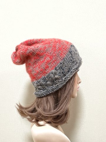 2トンカラーニット帽です。 編み方変えました。明るいコーラルレッドなので、グレージュと一緒に編むことで落ち着いた配色で合わせやすいカラーアイテムです😊